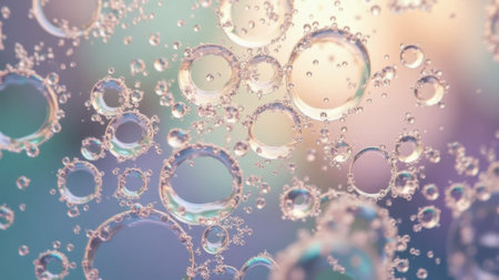 Colorful macro shot of translucent bubbles in liquid with soft pastel background. That the image is generated using AI.