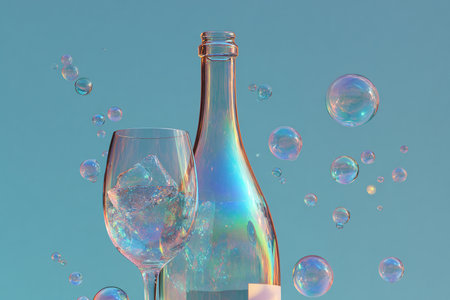 bottle and glass of wine with bubbles on a blue background.