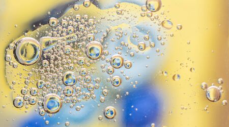 Close up yellow and blue bubbles abstract background. Oil on water photography.