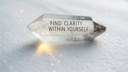 A faceted quartz crystal inscribed with 'Find Clarity Within Yourself' rests on a textured surface, emitting a gentle glow, perfect for promoting self-reflection and inner peace.