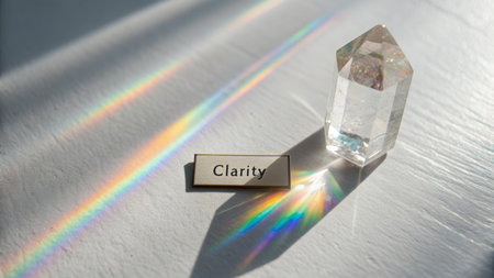 A faceted crystal prism refracts sunlight to cast a vibrant rainbow spectrum across a surface, illuminating a tag labeled 'Clarity', representing focused insight and enlightened understanding, perfect for concepts of focus, new beginnings, and mental illumination.