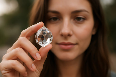 Woman holding a clear faceted crystal ball, representing clarity, fortune telling, and exploring future potential