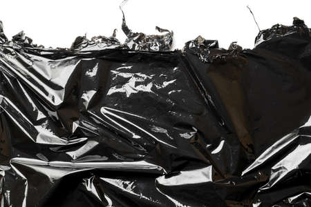 Black background. Black shiny film bag pattern isolated on white with copy space. Wrap transparent dark cellophane texture. Creative crumpled background