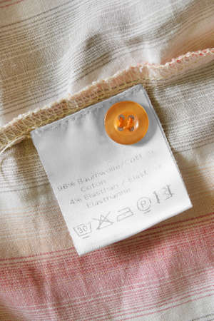 Fabric composition and care instructions clothing label on textile background closeup