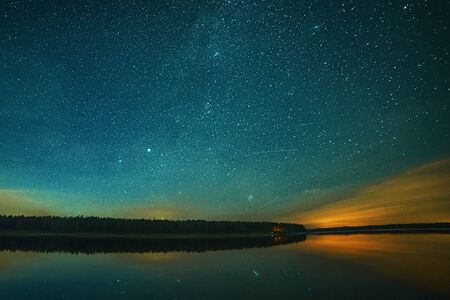 Night sky with stars and milky way over the lake. Long exposure photograph.