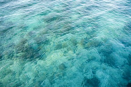 Emerald water texture, transparent sea surface with a rocky bottom. Aerial view, turquoise color, natural background