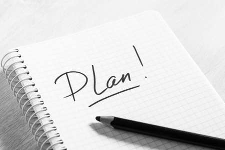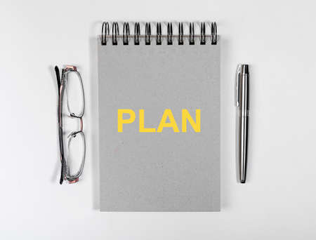 Word PLAN written on a colored block in a book on white table.