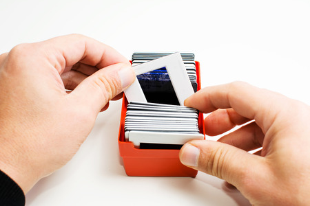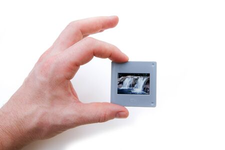 The hand holds one transparent slide used for the slide shows. The old method for doing presentation of the pictures.