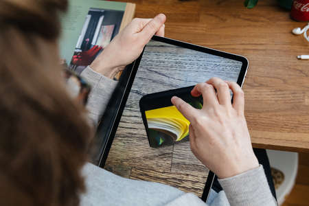 Paris, France - April 16, 2020: Curious Woman looking on Apple Computers internet website on iPad Pro tablet new iPhone SE inspection on Augmented Reality display