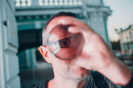 Portrait of a man with glass sphere ad eye at night city