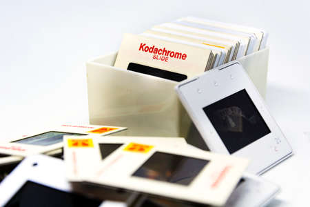 Rome, Italy, 22 April 2020: a group of Kodachrome brand slides from the 70s inside a plastic box isolated on a white background. Photographic supports now obsolete.