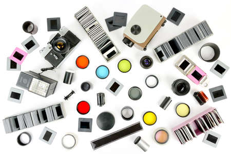Top view of retro camera and slide projector with accessories isolated on white background. Flat lay