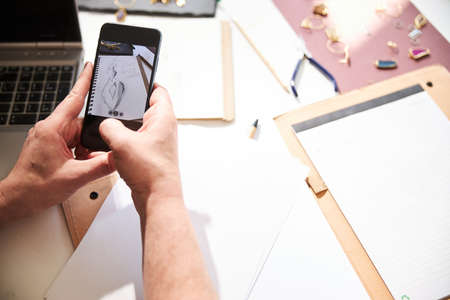 hand using phone taking picture on work desk