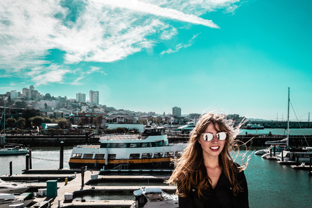 A girl walks on a pier by the sea with waves and a strong wind in a black sweater and jeans. Pink dawn and seagulls in the sky. Confidence in life. Determination