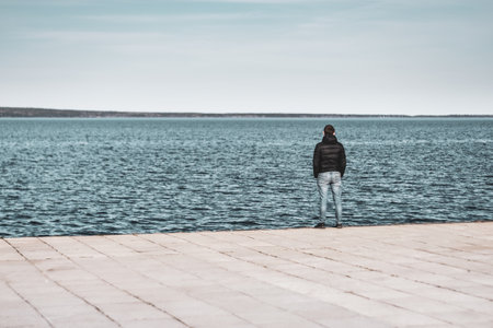 a lonely man stands on the shore of the lake and looks into the distance. View from the back. High quality photo