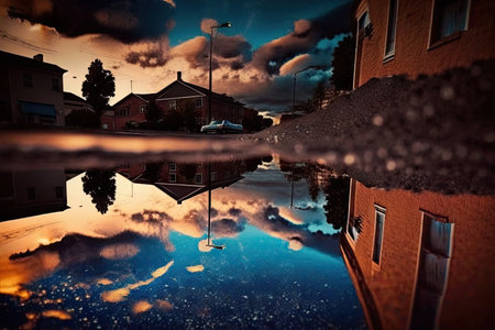 reflections of the sky in puddle after a rain storm, created with generative ai