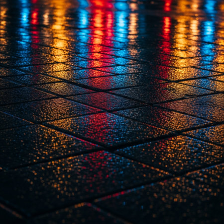 Puddles forming on a wet pavement, reflecting the cloudy sky and city lights.