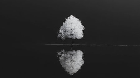 A solitary, luminous tree stands reflected in perfectly still, dark water, creating a symmetrical and serene composition.
