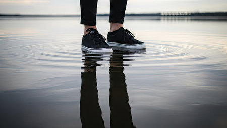 Reflection of a person standing near a puddle. Style is a reflection of your attitude and your personality. The concept of loneliness