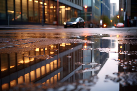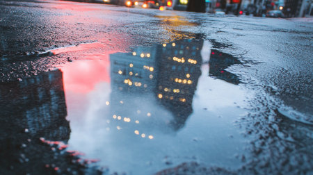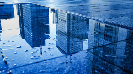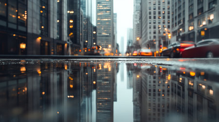 A captivating urban scene showcasing the reflection of skyscrapers in a puddle on a rainy street. Dramatic clouds enhance the moody city environment.