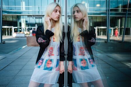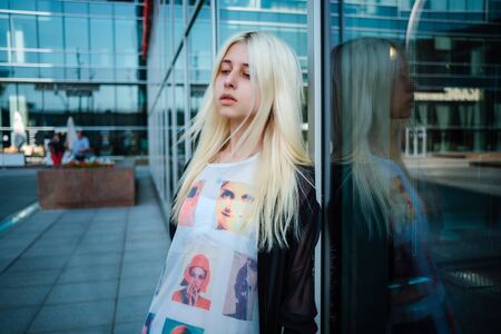 Beautiful young albino woman posing near a business center in Moscow. Japanese fashion, unusual style