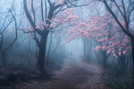 Ethereal Cherry Blossoms Shrouding Misty Forest Trail