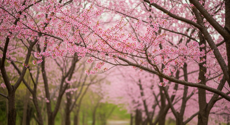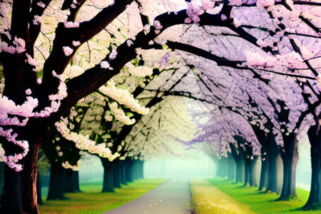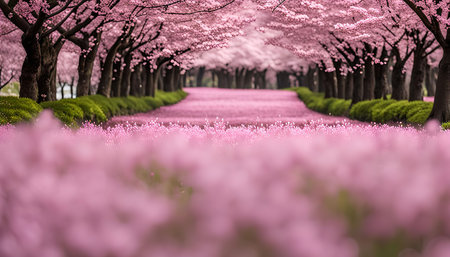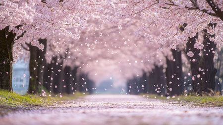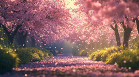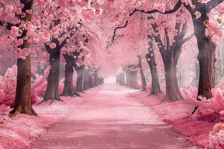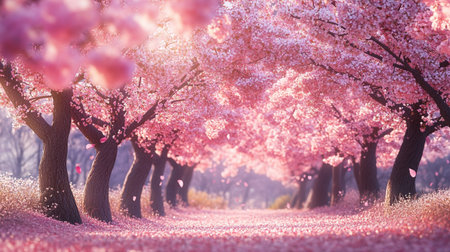 A picturesque path lined with cherry blossom trees, creating a tunnel of pink. The soft, pastel colors and shallow depth of field create a dreamy and romantic atmosphere.