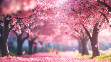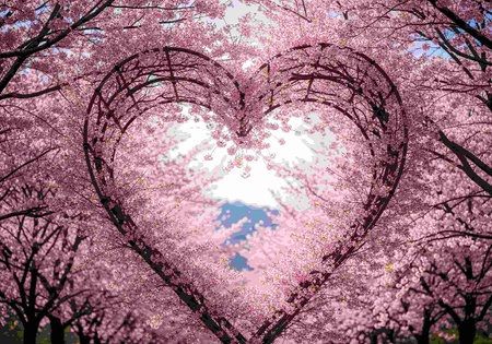 Cherry blossoms in full bloom with heart-shaped petals