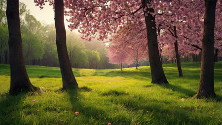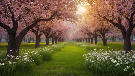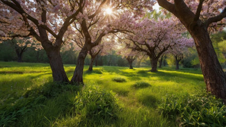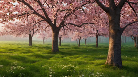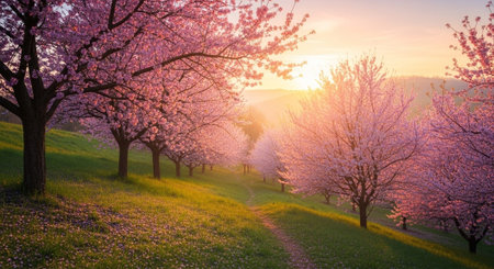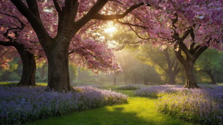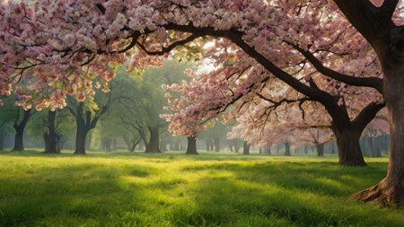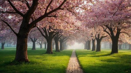 Cherry blossom trees in the park at sunrise