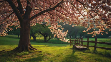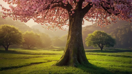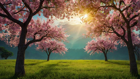 cherry blossom tree on meadow with beautiful sky and sun