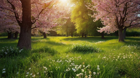 spring nature yellow flowers pink tree forest park generated alt. High quality illustration landscape background summer