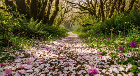 Pathway in a rain forest with pink flowers and green mossy trees