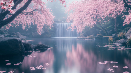 Cherry blossom in japanese garden with waterfall background.