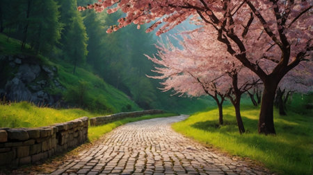 Cherry blossoms in full bloom along a stone road in spring