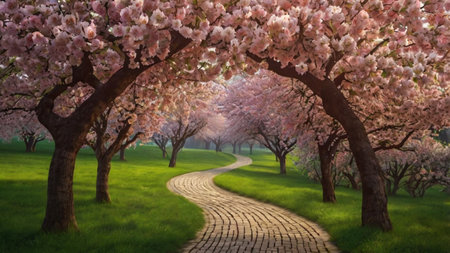 Cherry blossoms in full bloom in a spring park with a pathway