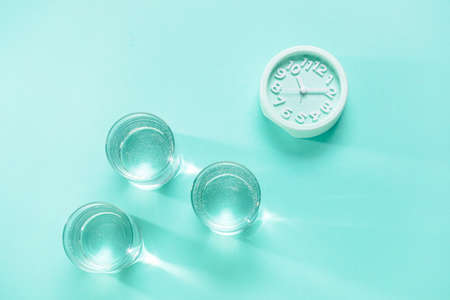 a glass of pure water on blue background. copy space for text. consept of healt life and diet.