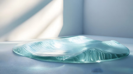 Rippled glass podium with wave-like textures, surrounded by soft, ambient lighting, creating a modern and elegant backdrop for creative or designs.