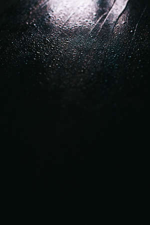 Dark wet asphalt with cracks and scratches. Abstract dark background with bokeh