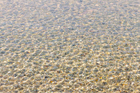 Abstract natural colorful background. Shallow water on a pebble sea beach on a calm sunny day