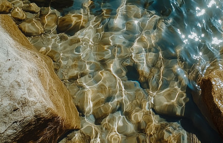 This image captures the serene beauty of crystal clear water gently reflecting sunlight, accompanied by natural stones at the edge, creating a tranquil outdoor scene.