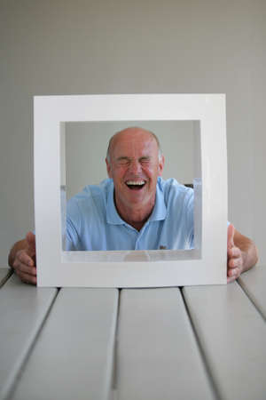 Happy one young mature man only creating frame with fingers.Copy space on white background. real people. Concept photo of cool, creative, confident, aspirations, manly, man.