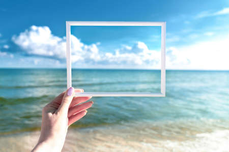 White frame in female hand. Summer sea and blue sky background. Mock up