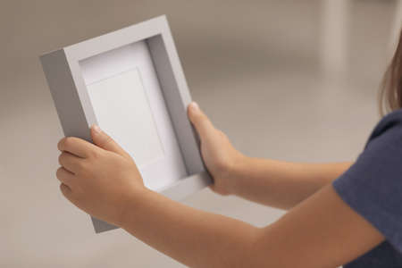 Close up detailed front view of white blank wooden frame with copy space, holding on man hand.