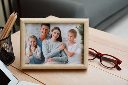 Senior man holding frame with photo of his wife and granddaughter at home, closeup