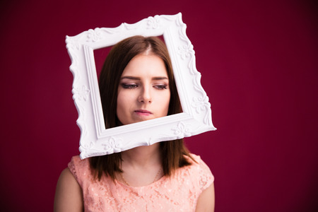 Millenial young woman with short blonde hair holds gilded picture frame in hands behind her facial portrait