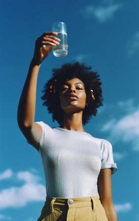 Portrait of beautiful young African woman holding glass with water and smiling : Generative AI