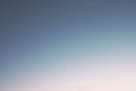 The Moon and a plane in the clear duotone gradient blue evening sky. Beautiful tranquil background. Concept of inspiration and exploration