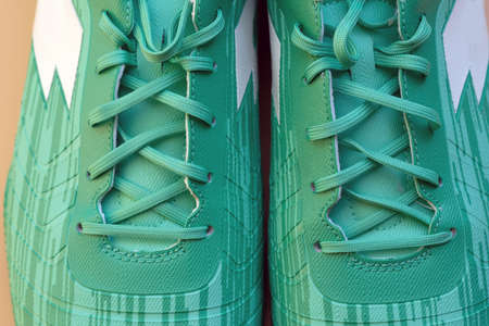 Green sneakers with laces close-up. Green laces on leather sports shoes top view. Sports shoes.