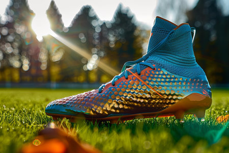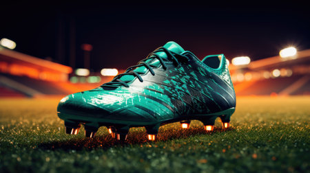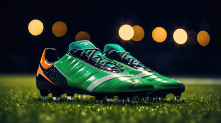 A pair of vibrant football cleats showcased against a dark background with colorful lighting. This image captures the essence of athletic performance and style.