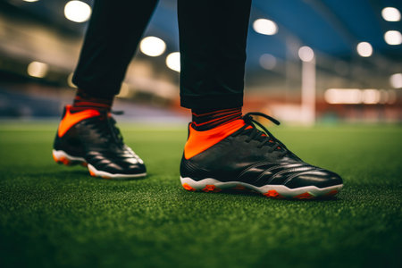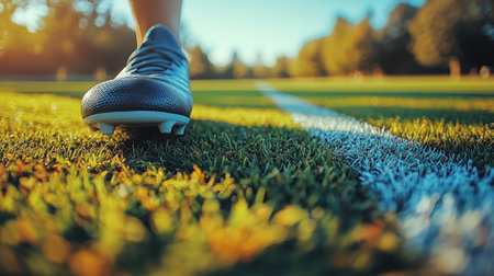 Soccer player walking on field, close-up of feet. Perfect for sports articles, soccer blogs, or athletic footwear advertisements